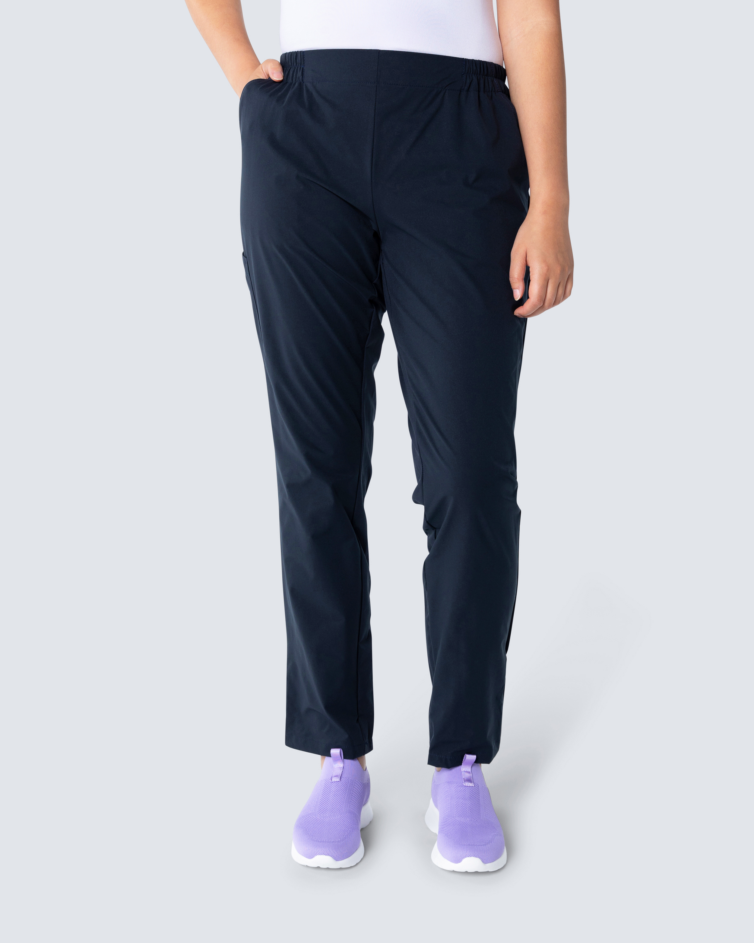 Joustavat unisex-malliset työhousut, joissa on mukava elastinen vyötärönauha. Housuissa on kaksi sivutaskua, takatasku ja painonapillinen sääritasku, jossa voi säilyttää erilaisia työvälineitä ja varusteiden. Työhousujen pituus on säädettävissä kuminauhan ja lahkeiden päissä olevien painonappien avulla. Housut on valmistettu joustavasta ja hyvin hengittävästä polyesteristä, ja ne tarjoavat optimaalisen mukavuuden pitkiä työvuoroja tekeville hoitoalan ammattilaisille.