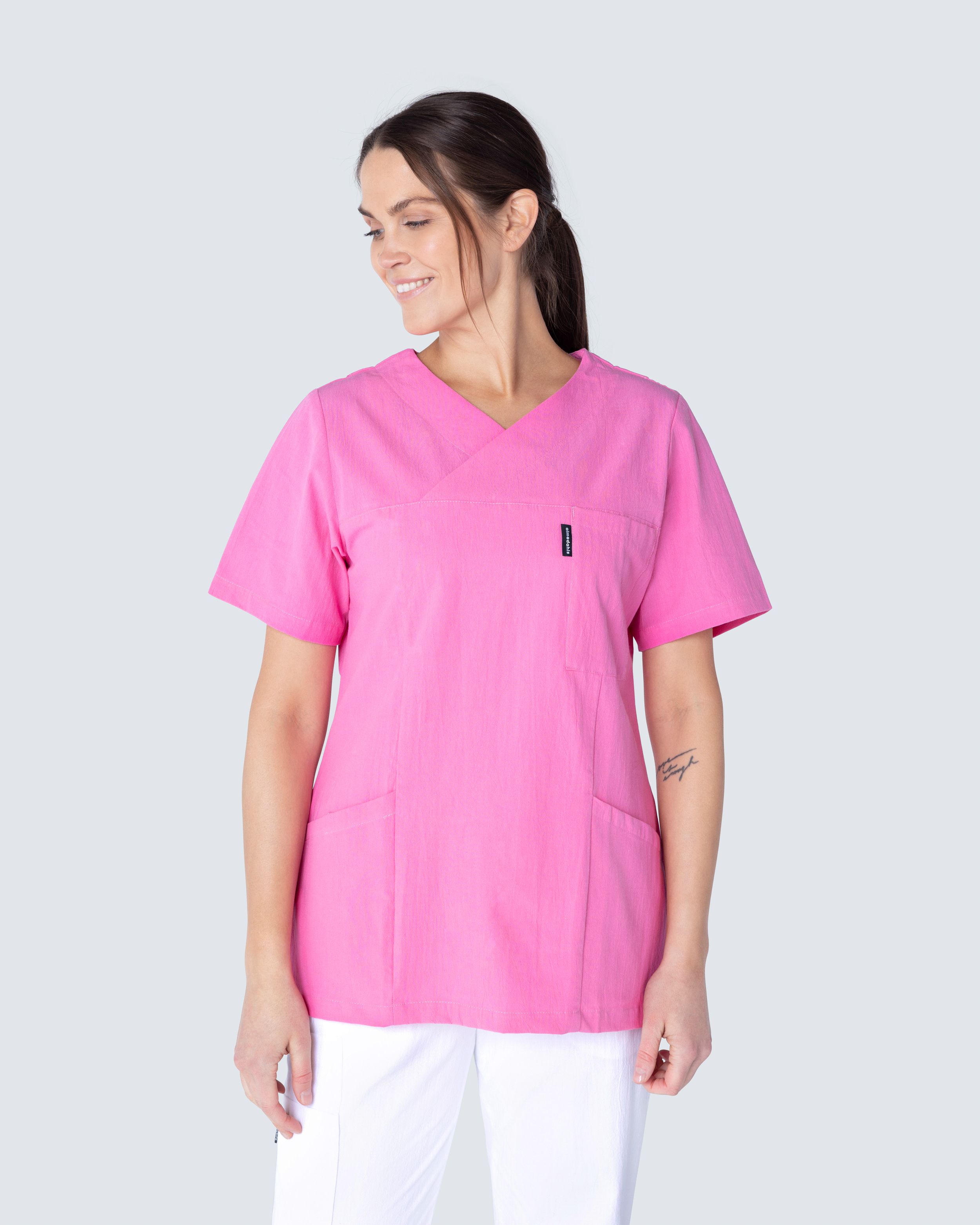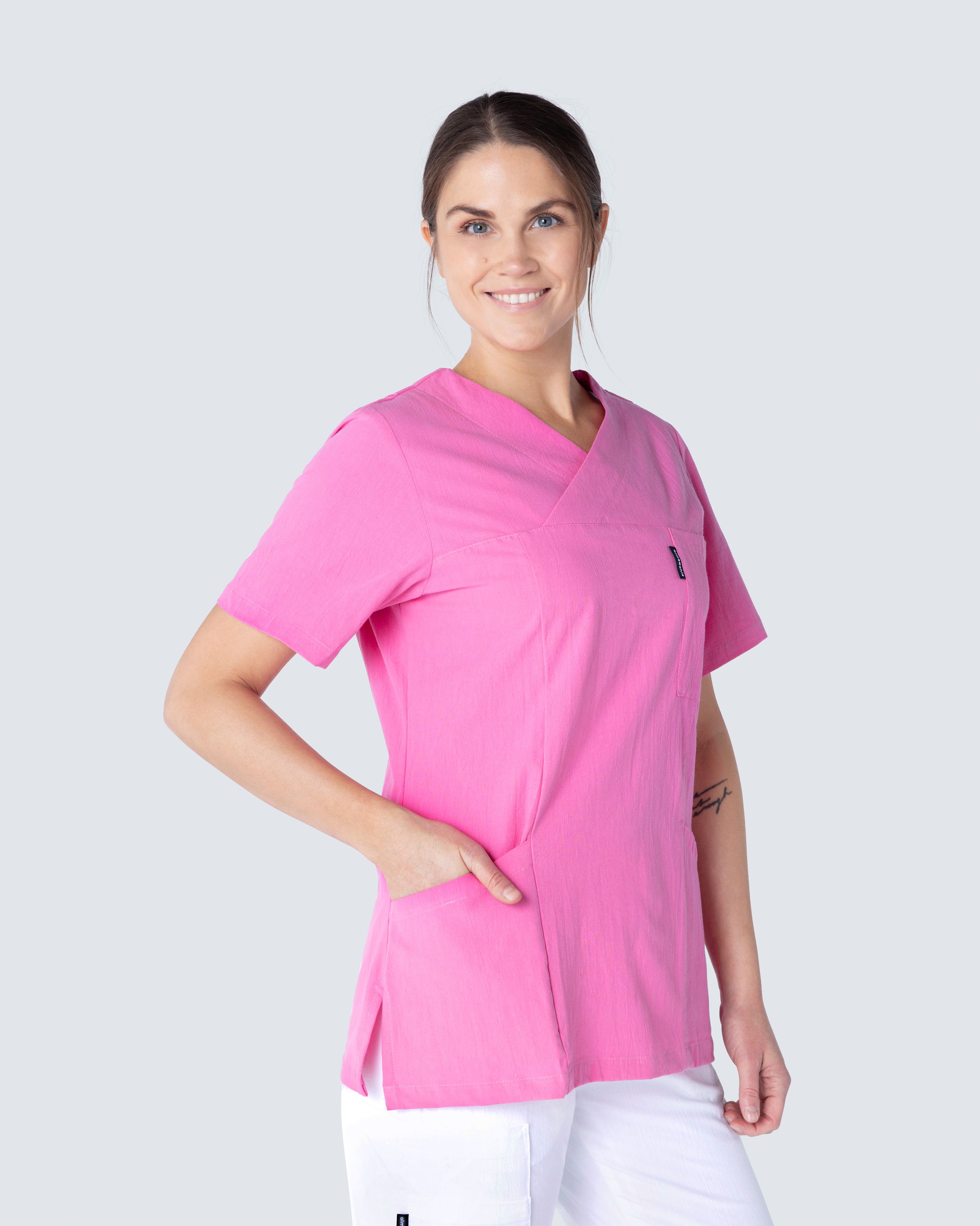 Pusero ryppyisestä puuvillasta, joka antaa kevyen ja viileän tunteen. Ryppyinen puuvilla on helppo hoitaa ja vaatii minimaalista hoitoa, kuten silitystä. Puserossa on v-pääntie ja malli on hieman kaareva, mikä antaa mukavan siluetin ja istuvuuden. Sekä rintataskussa että kahdessa lonkkataskussa on puhelintasku ja avainreikä. Taskujen ansiosta sinulla on runsaasti tilaa erilaisille työvälineille ja tarvikkeille, joita tarvitset työpäivän aikana.