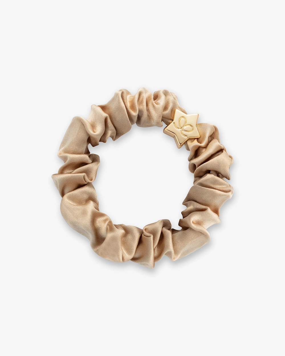 Silkesscrunchie By Eloise London, koristeellisella tähtimäisellä kultakoristeella. Pehmeä materiaali minimoi hiusten kulumisen ja antaa samalla tyylikkään vaikutelman. Sopii täydellisesti sekä hiuskoristeeksi että tyylikkääksi rannekoruksi – käytännöllinen ja tyylikäs valinta sinulle, joka haluat tuoda persoonallisuuttasi esiin työpaikalla.