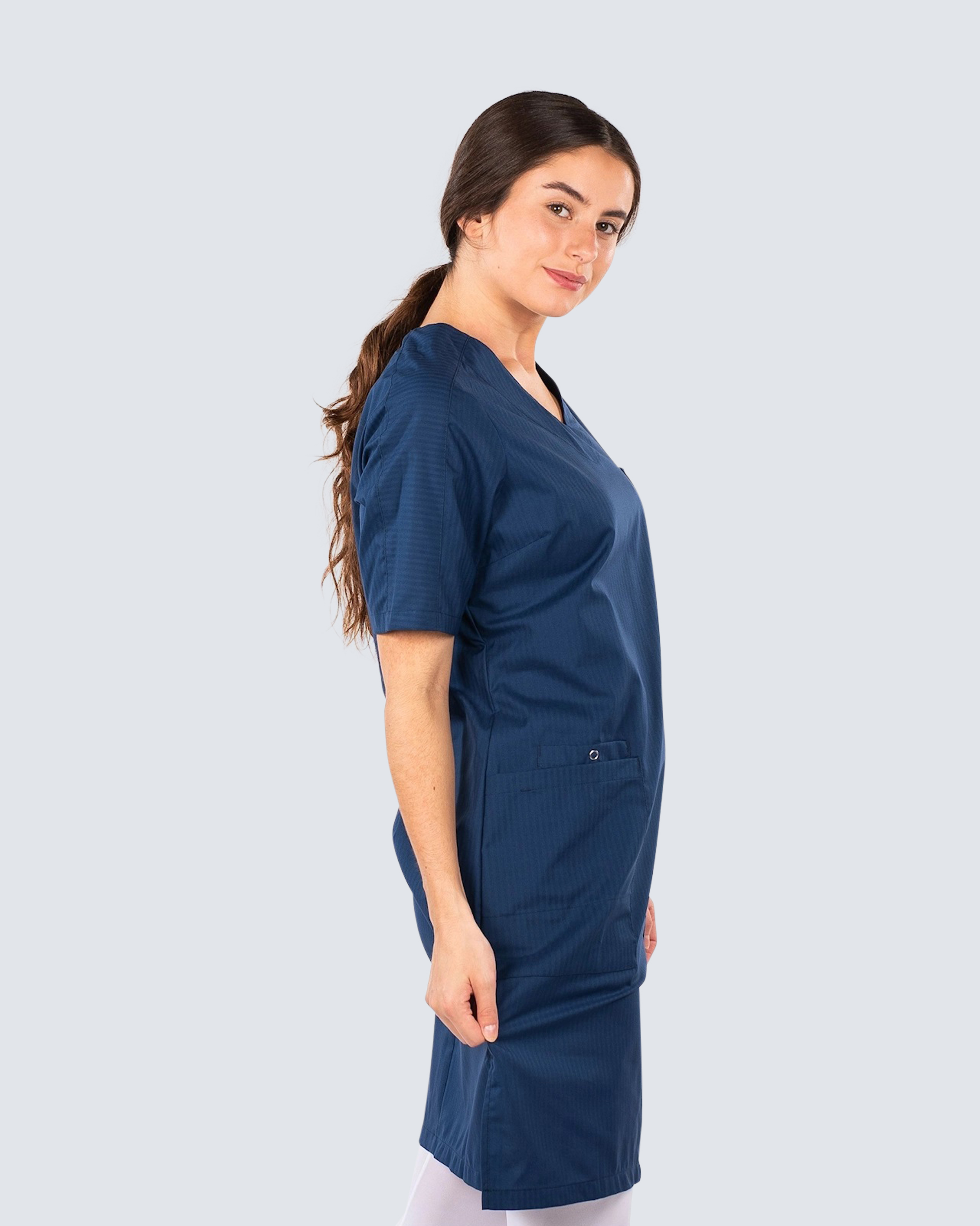 Hejco Charade -malliston mekko, jossa on kevyt kavennus. V-kaula, sivuhalkiot ja lyhythihainen. Sivutaskut, rintatasku ja puhelintasku. Avainsilmukka. Mekko heille, jotka työskentelevät terveydenhuollossa. Vaatteen materiaali on OEKO-TEX-sertifioitu, joten se ei sisällä kemikaaleja, jotka ovat terveydelle haitallisia.