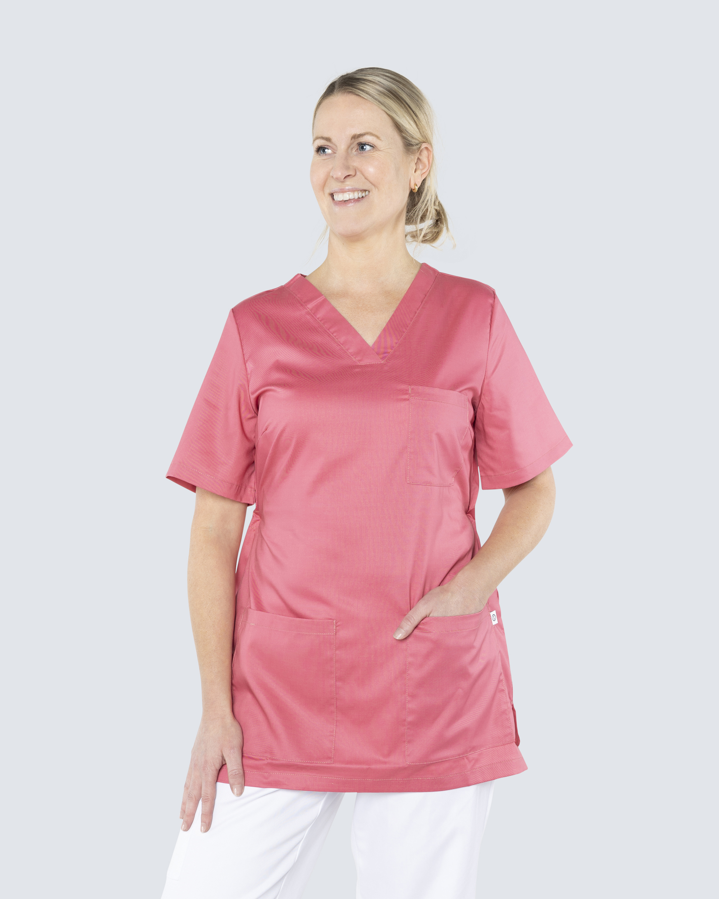Hieman tyköistuva naisten tunikan muotoilu yhdistää mukavuuden ja trendikkään tyylin. Pehmeä hieman joustava kangas tarjoaa sekä liikkumisvapautta että mukavaa kiiltoa. Käytännöllisillä sivutaskuilla ja avainrenkaalla varustettu tunika sopii erinomaisesti hoitotyöhön. Sivuhalkiot ja säädettävä vyötärö edistävät ihanteellista liikkumisvapautta.