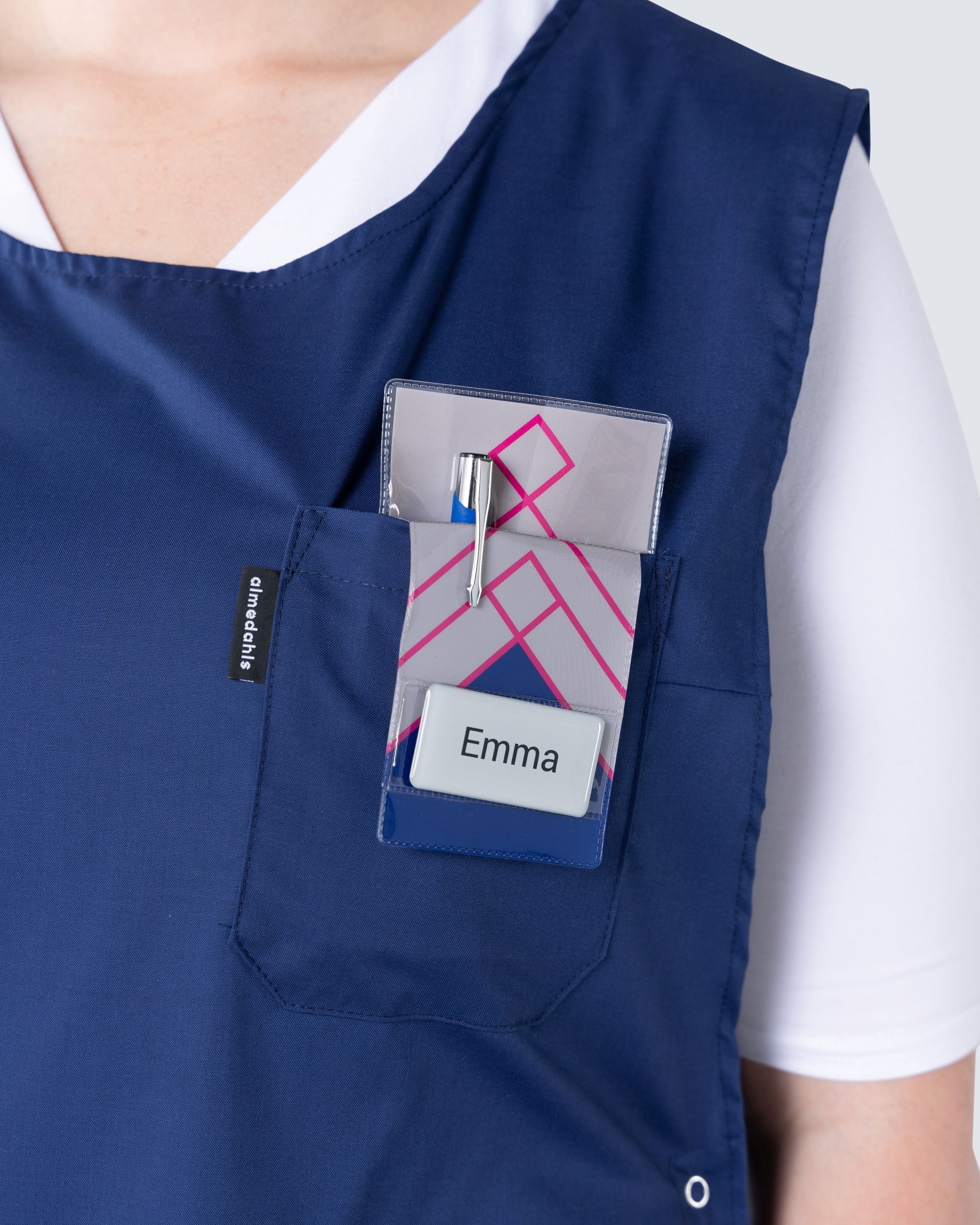 Värikäs muovinen kynätasku, joka takaa, että kynät eivät katoa ja että mustevuodot eivät likaa vaatteita. Kätevä tapa pitää kynä aina lähettyvilläsi. Kynätaskun edessä on tasku nimikyltille.