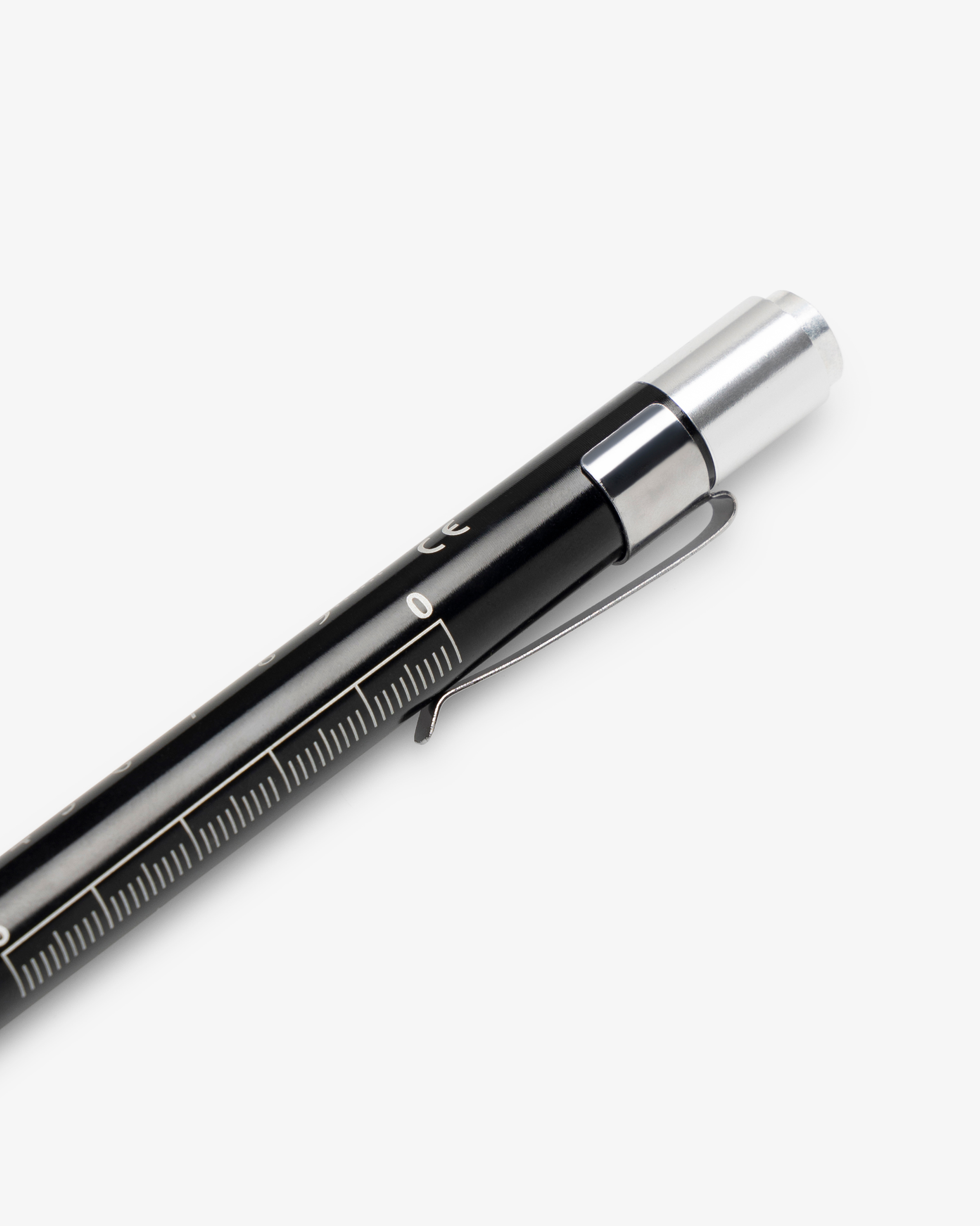 Käytännöllinen kynälamppu silmätutkimuksiin, jossa on pupillin mittari (2-9 mm) ja etäisyysmittari (0-50 mm). Lamppu on 13,5 cm pitkä ja halkaisijaltaan 1,2 cm, ja siinä on LED-valo. Paristo: 2 x AAA (ei sisälly).