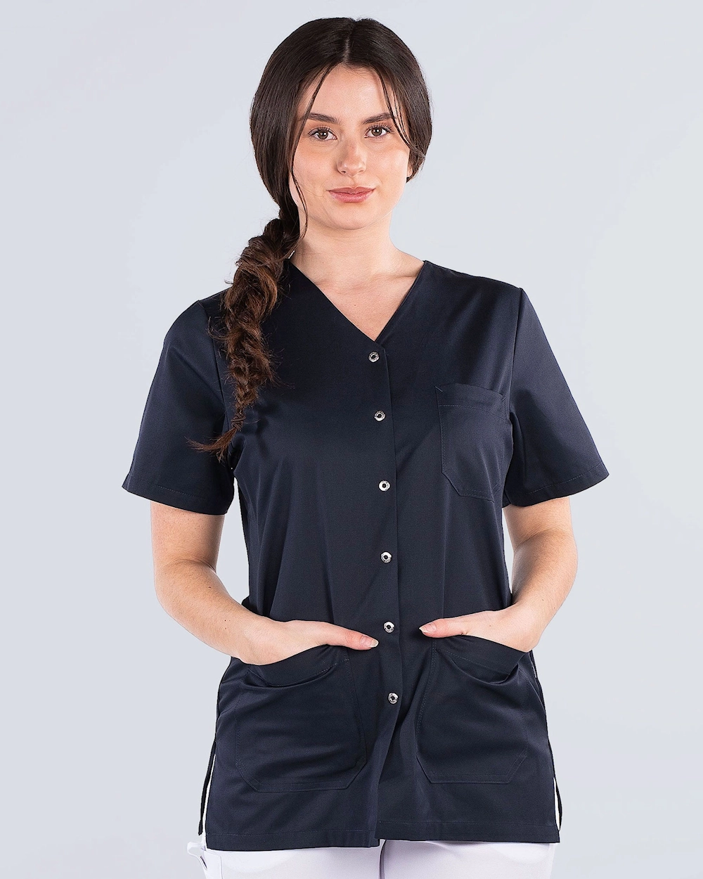 Hoitotunika, jossa käytännölliset painonapit ja koristeellinen v-pääntie. Tunika on kevyesti kavennettu mukavan istuvuuden saavuttamiseksi. Sivuhalkioiden ansiosta saat runsaasti liikkumavaraa. Tilava rintatasku sekä lonkkataskut puhelintaskulla ja avaimenpidikkeellä tarjoavat runsaasti säilytysmahdollisuuksia.