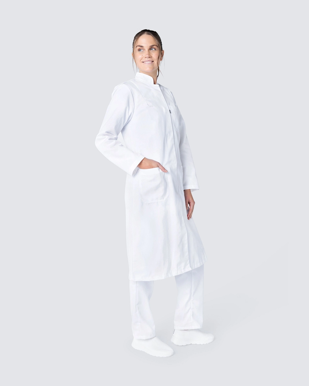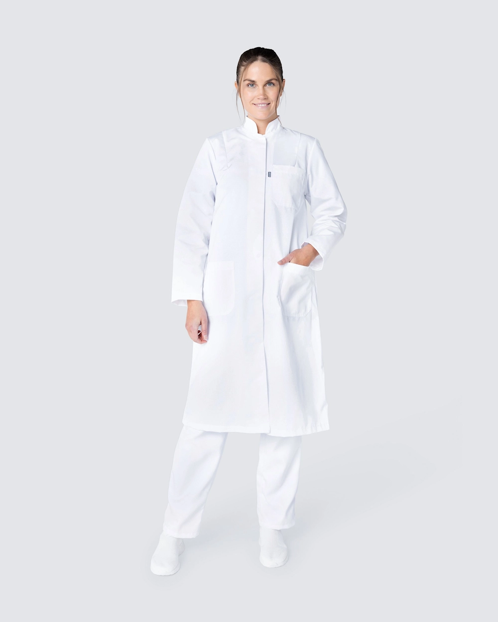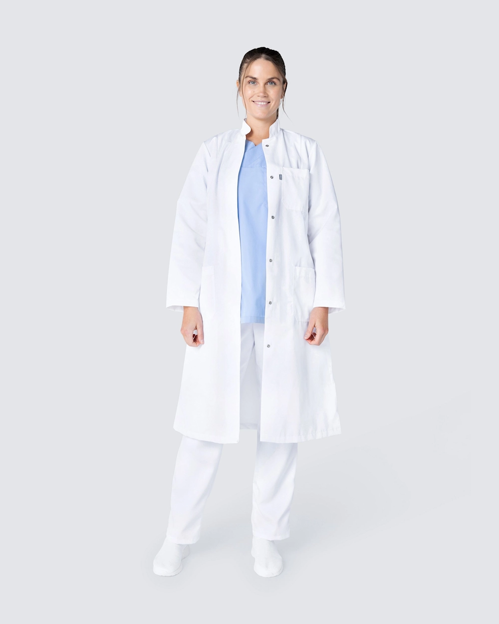 Klassinen naisten lääkärintakki, a-linjamuotoinen. Takissa on pystykaulus ja piilotetut painonapit. Kaksi tilavaa lonkkataskua ja rintatasku antavat runsaasti tilaa työvälineille.