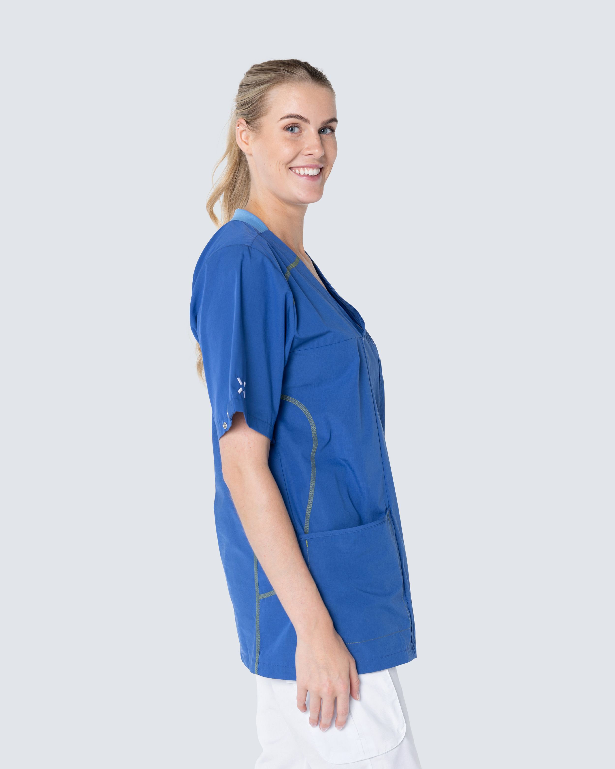 Unisex-mallinen, urheilullinen bussarongi, jossa on pyöreä V-pääntie ja joustava selkäosa. Vaatteessa on käytännöllinen nepparikiinnitys, kaksi tilavaa lantiotaskua ja rintatasku säilytystä varten.