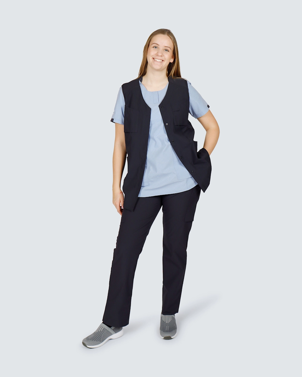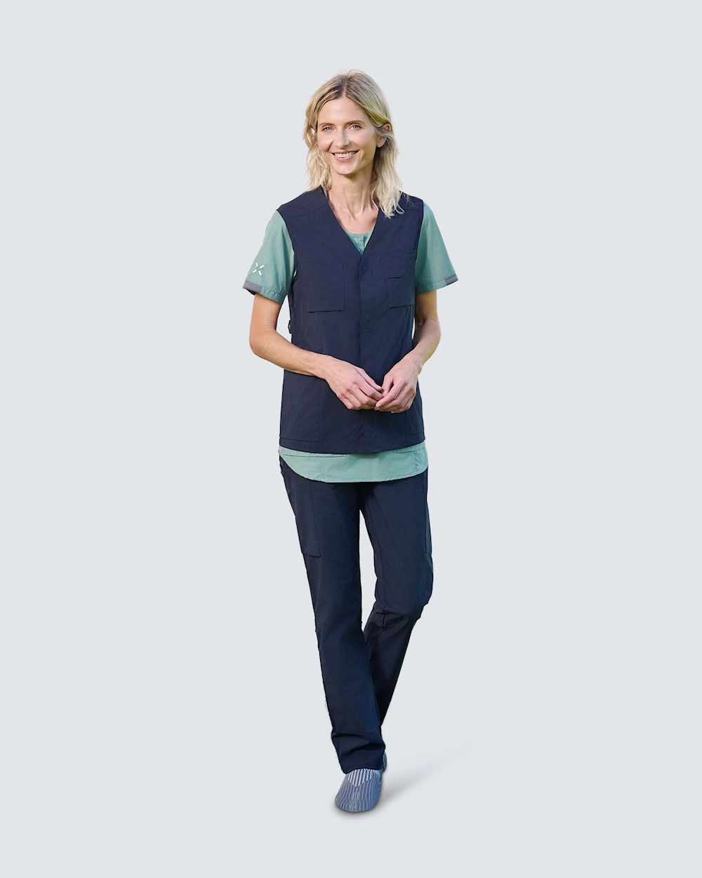 Nykyaikainen ja toiminnallinen naisten monipituinen liivi, joka täyttää terveydenhuollon ammattilaisten vaatimukset mukavuuden ja yksilöllisen tyylin suhteen. V-muotoinen kaula-aukko ja säädettävät pehmusteet selässä takaavat joustavan istuvuuden koko työpäivän ajan. Kätevät lantio- ja rintataskut, mukaan lukien lanyardit, matkapuhelintaskut ja kynätaskuhihnat, pitävät välttämättömät varusteet käden ulottuvilla. Piilotettu painonappikiinnitys ja sivuhuokoset helpottavat tehtäviä ja lisäävät liikkumisvapautta. Kestävä ja kevyt materiaali tekee liivistä ihanteellisen pitkiin työvuoroihin, myös intensiivisissä ympäristöissä.