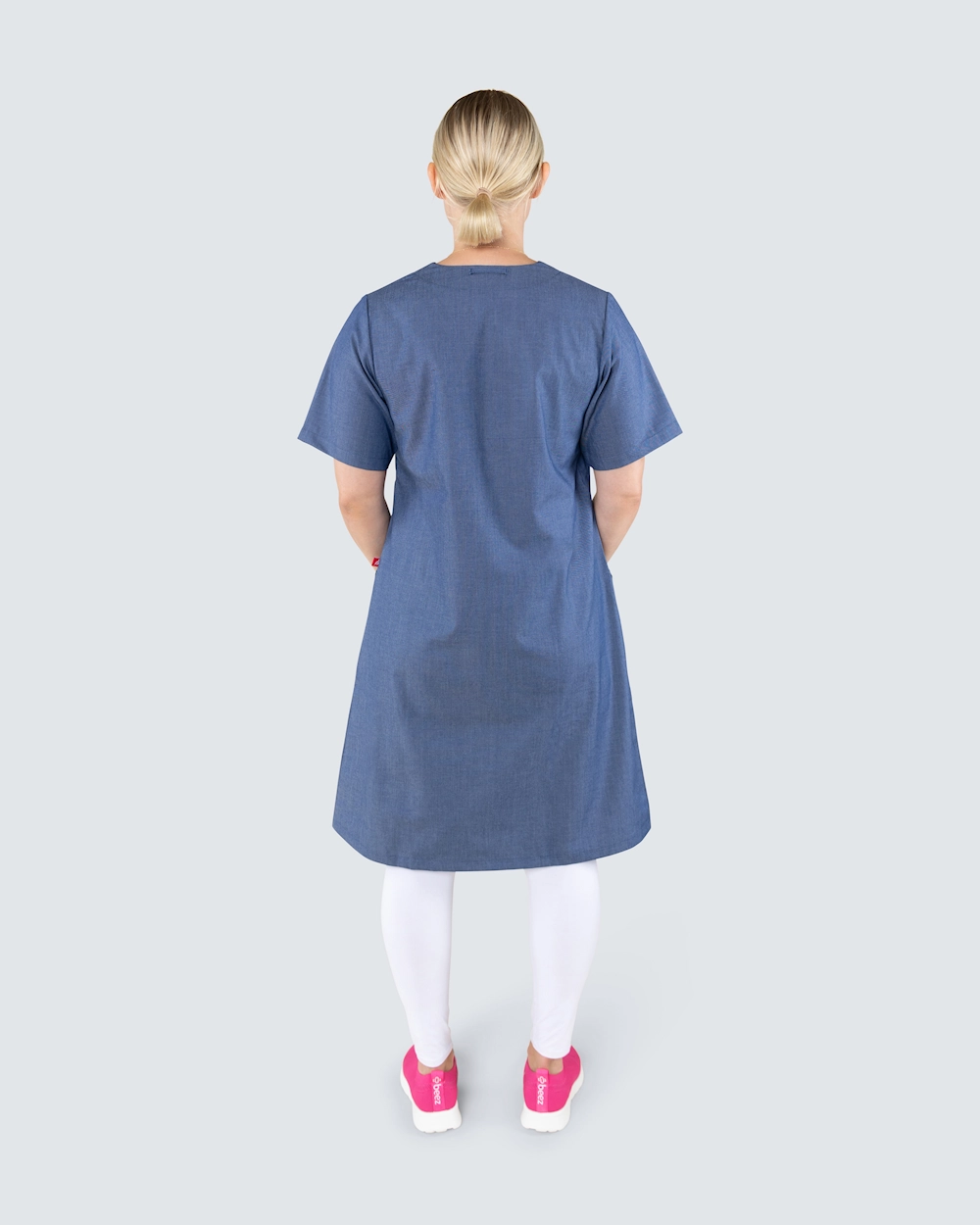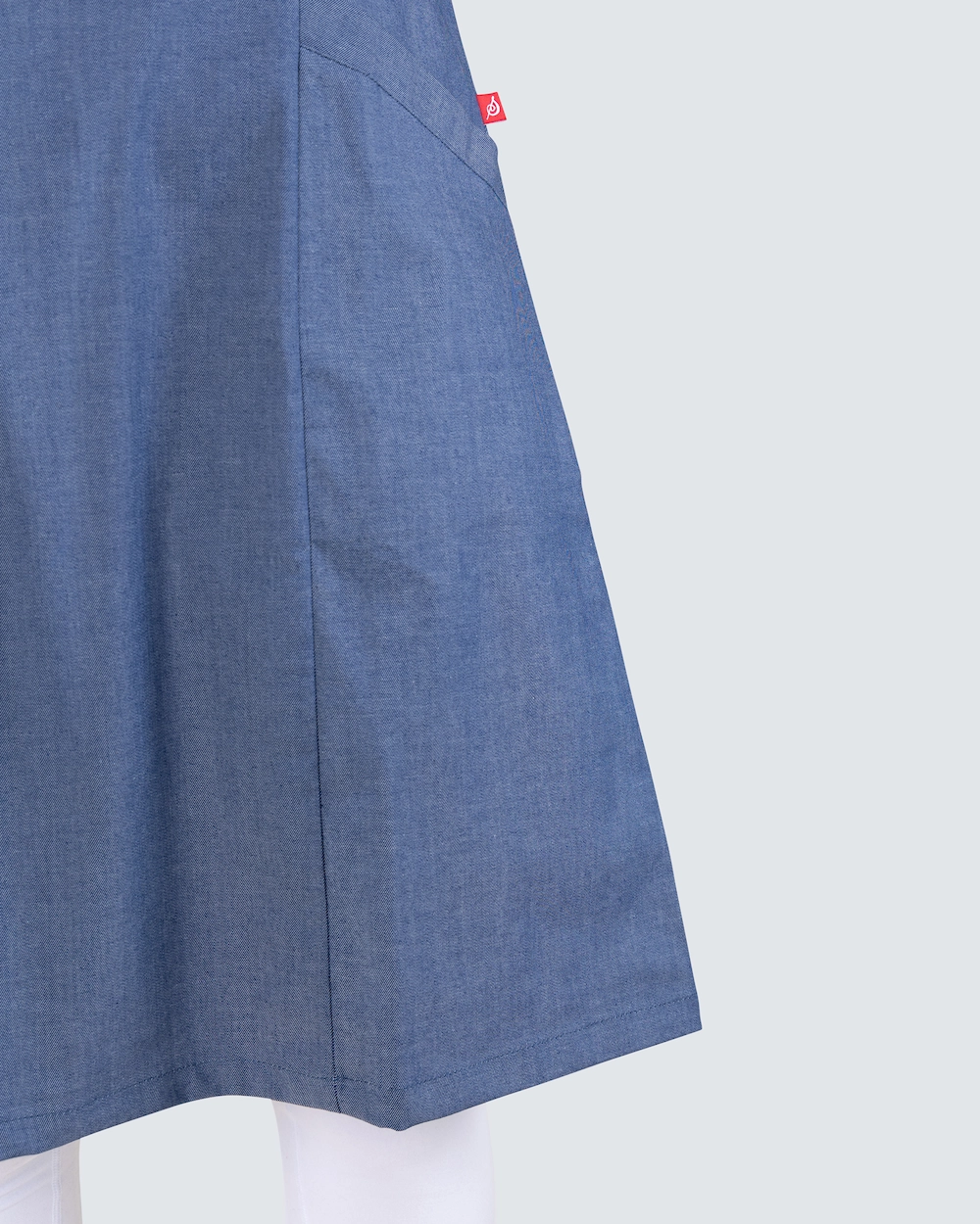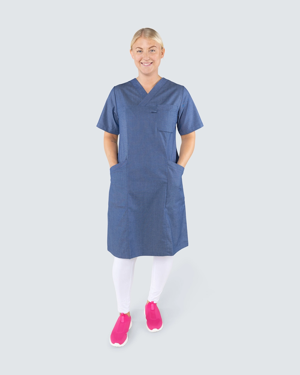 Tämä mekko on valmistettu XLA stretch-materiaalista, mikä antaa mukavan ja joustavan vaatteen. Mekko on a-linjamuotoinen mukavan istuvuuden takaamiseksi. Mekossa on kaksi sivutaskua sekä yksi rintatasku, jossa runsaasti tilaa työvälineille, kynille ja muistilehtiöille.