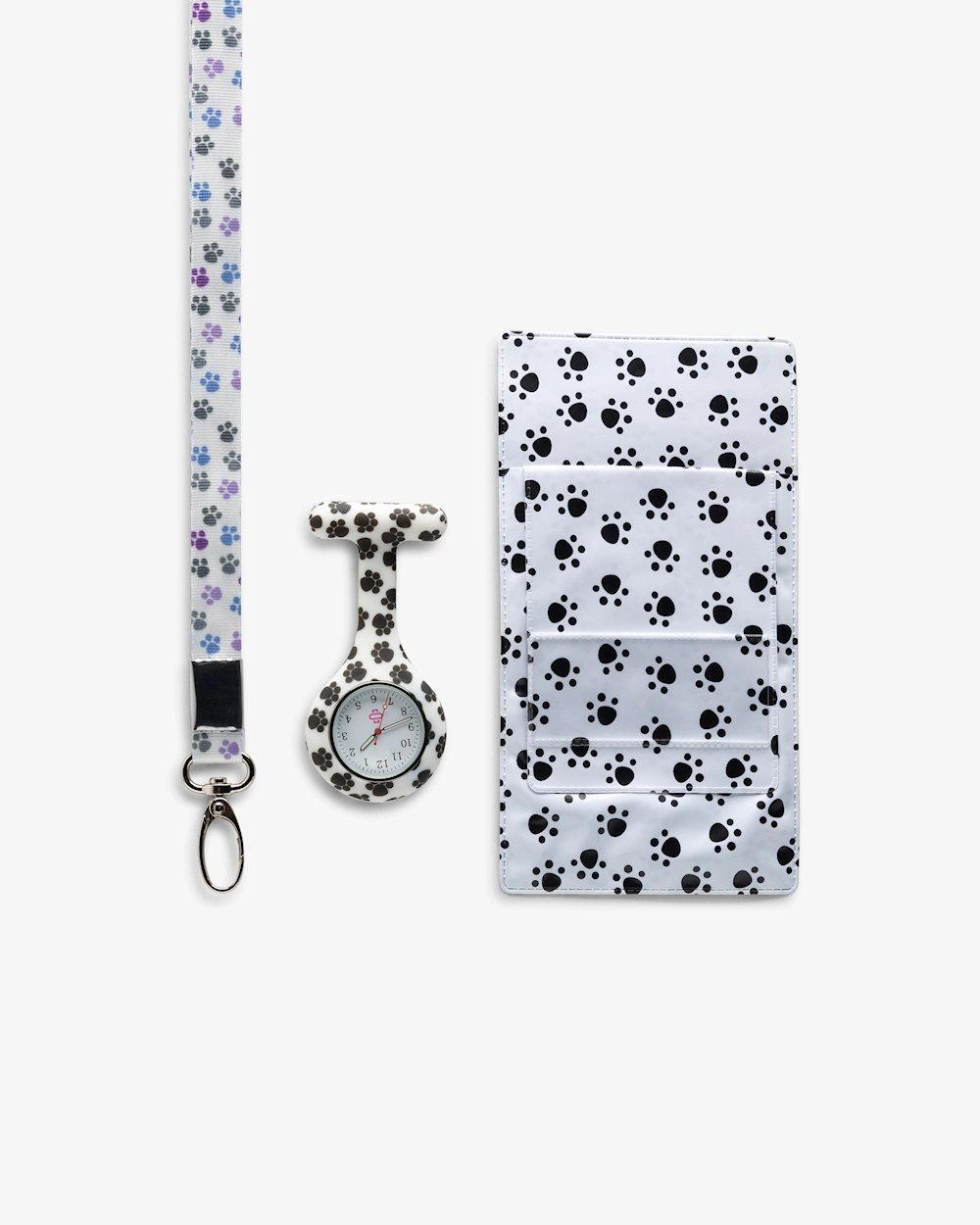 Tyylikäs ja käytännöllinen paketti eläinten ystäville. Mukana yhteensopiva silikoninen Hoitajan kello, avainnauha ja kynätasku – kaikki hillityllä tassukuvioinnilla, joka tuo työasuun persoonallisuutta ja pehmeyttä.